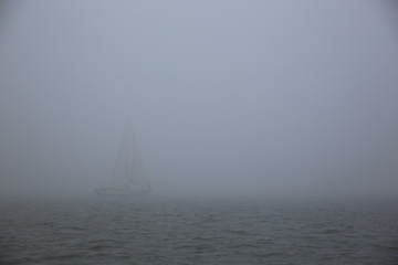 Ein sich vorübergehend ausbreitendes Hochdruckgebiet führt zu einer im Herbst typischen Nebelbildung. Dabei legt sich die kalte Luft auf das im Verhältnis hierzu aufgewärmte Küstengebiet und führt zu extrem geringer Sichtweite, die an diesem Morgen zwischen 50 m und 1 kbl beträgt. Am frühen Morgen legen wir von Glückstadt in mystischer Atmoshäre ab. Wir steuern mit dem elbabwärts setzenden Ebbstrom entlang der roten Fahrwassertonnen gen Westen. Dabei gibt es für den Rudergänger keinerlei Orientierung außer das Schiff konzentriert nach dem Kompasskurs zu steuern, den der Navigator ihm aufgibt. Wie in der Wüste besteht für den Menschen keine Möglichkeit sich im Nebel zu orientieren.