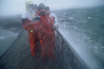 Im Herbst 2000 herrschte stürmischer Wind auf Helgoland. Die Charisma-Crew arbeitet sich bis auf die nördliche Außenmole des Schutzhafens von Helgoland vor, wo ihr die überkommende Gischt ins Gesicht peitscht.