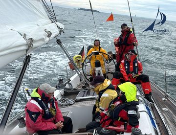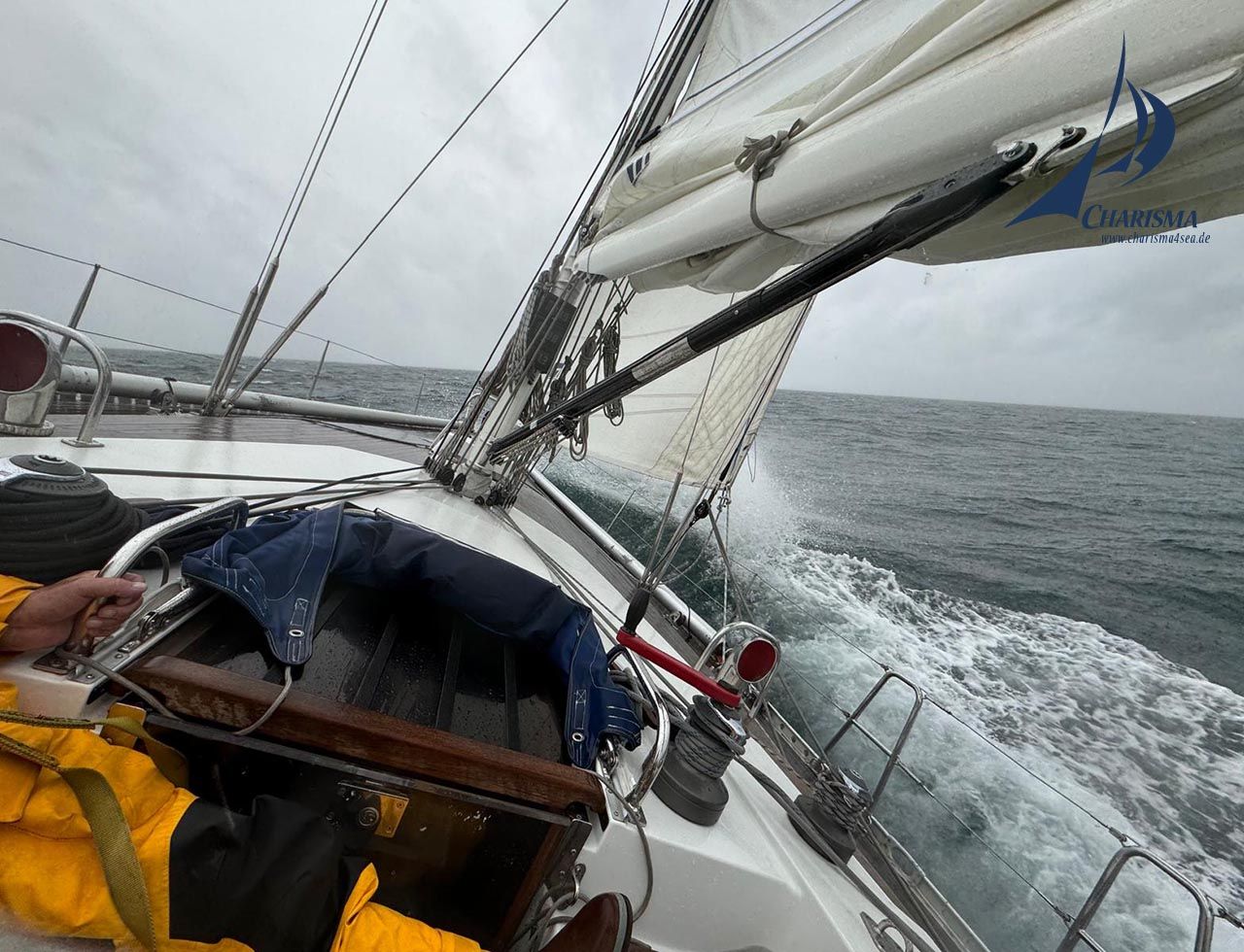 Der Gezeitenstrom kentert, der Wind frischt auf. Bei 6-7 Bft. aus SW binden wir das zweite und dritte Reff ins Großsegel. Wir segeln auf strammem Am-Wind-Kurs mit überkommenden Seen und unterspültem Leedeck.