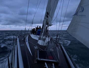 Mit rasanter Fahrt segeln wir in die Morgendämmerung - das Leuchtfeuer von Helgoland weist uns mit seinem Widerschein den Weg. Optimales Hochseesegeln – wäre es nur nicht so kalt! Unter Segeln steuern wir in den Hafen von Helgoland und bergen im Vorhafen die Segel. Um 07:50 MESZ machen wir längsseits an einer Alu-Yacht fest, Distanz 49 sm.