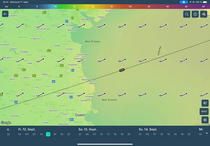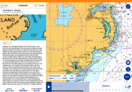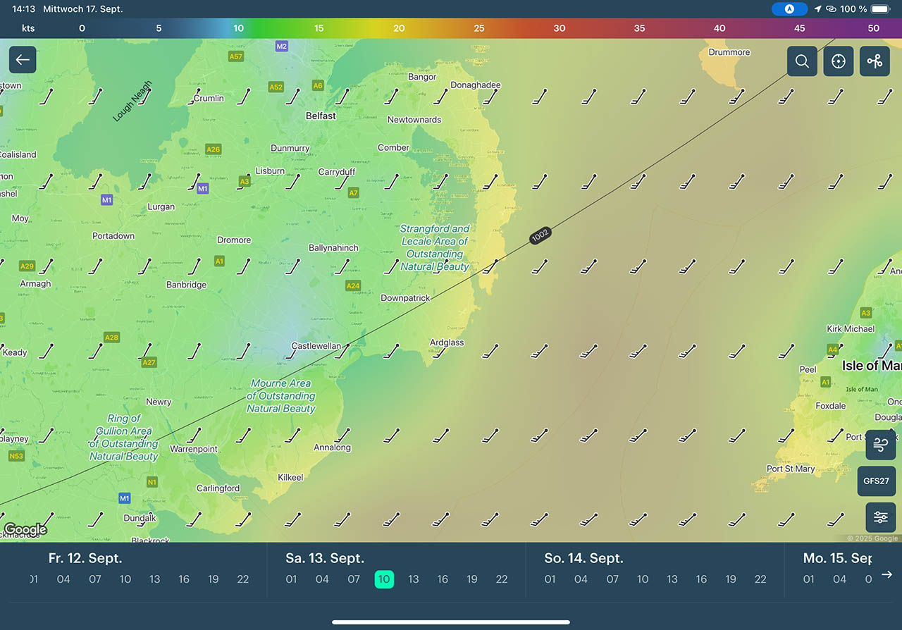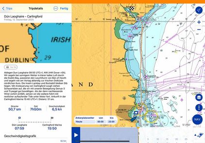 Wir legen um 06:50 Uhr UTC+1 in Carlingford ab (HW Dover +4h) und steuern mit der ablaufenden Tide aus dem Carlingford Lough. Bei Südwest 5 Beaufort…