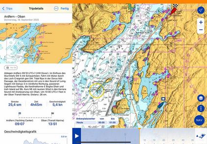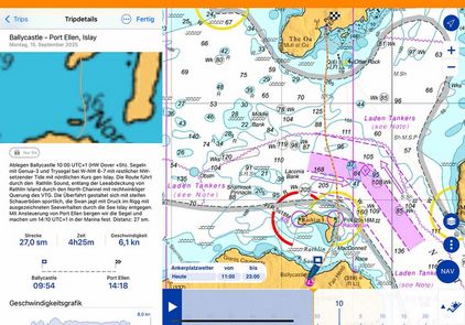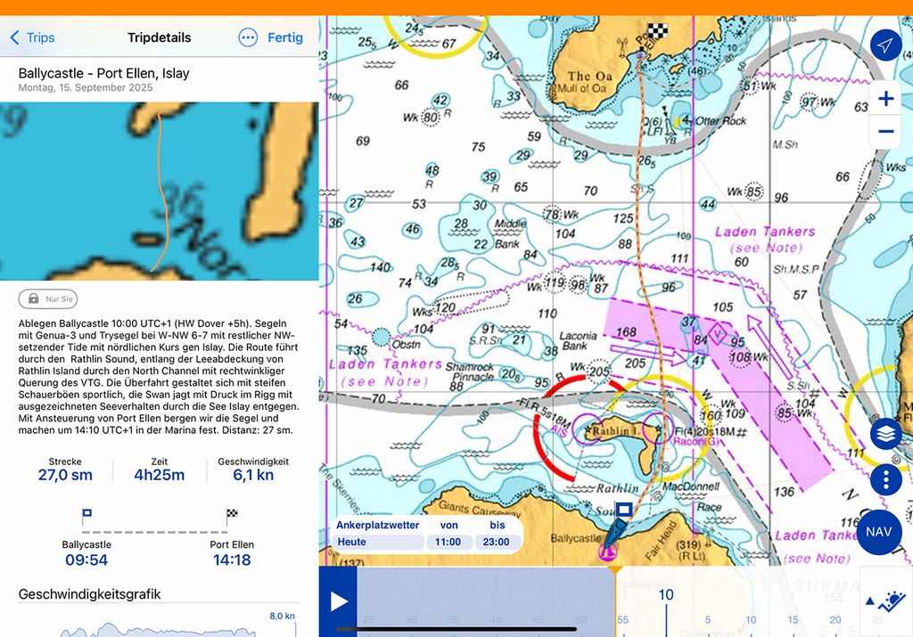 Wir legen um 09:40 Uhr UTC+1 in Port Ellen ab (HW Dover +3h). Unsere Route führt rund um die südöstliche Huk von Islay, mit Unterstützung der Tide…