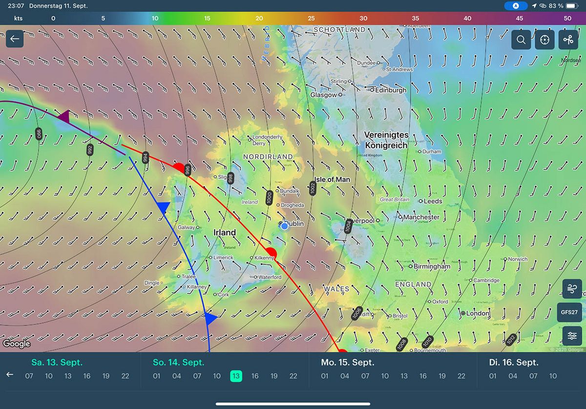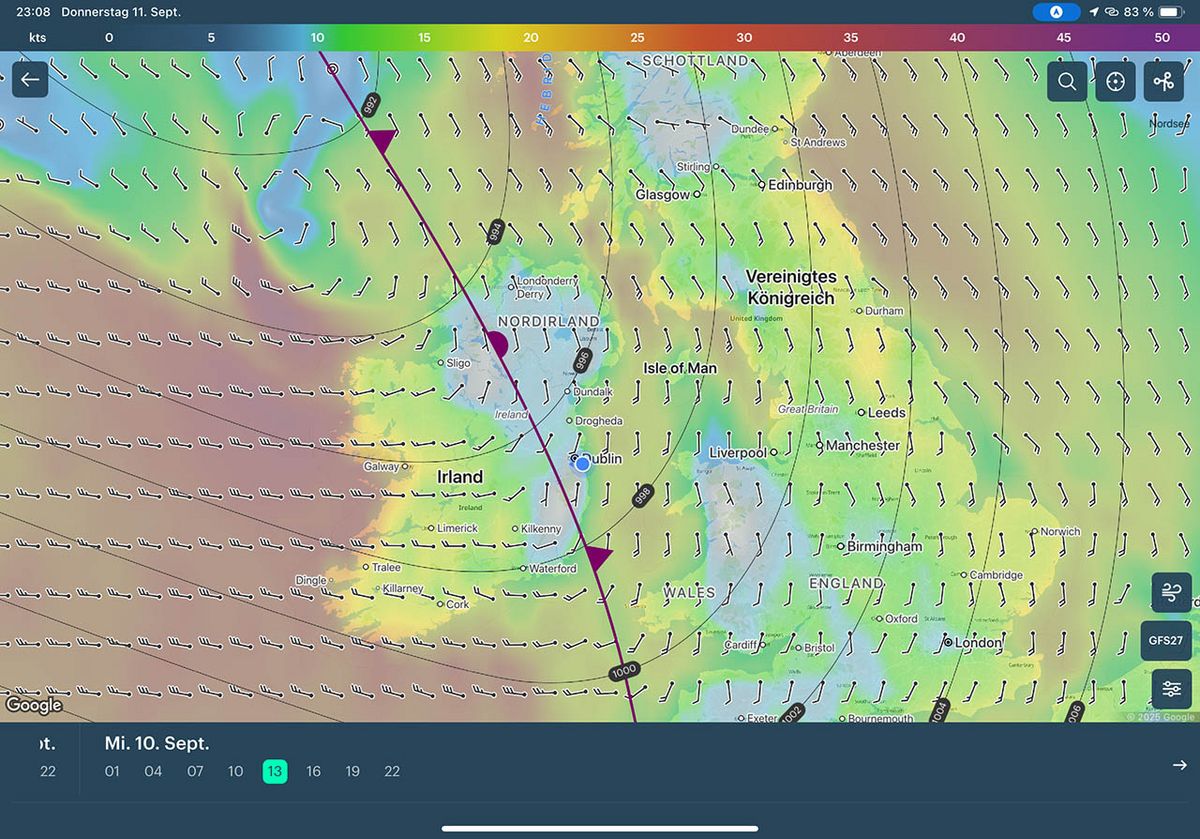 Das stürmische Wetter hält an. Um 10:00 Uhr UTC+1 (HW Dover +5h) legen wir in Ballycastle ab und segeln bei West bis Nordwest 6–7 mit Genua III und…