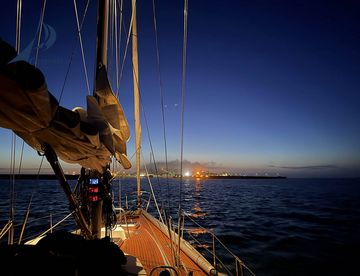 Zum Abschluss unseres ersten Segeltags nehemn wir einen Anleger im Cockpit. Später klingt der Abend bei einem lebendigen nächtlichen Sit-in im Salon aus.