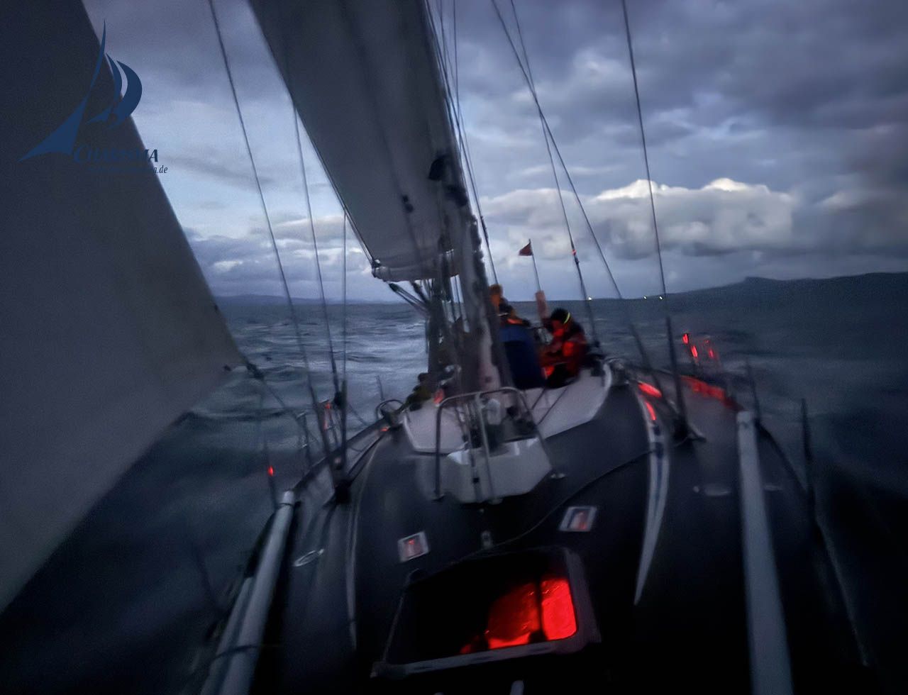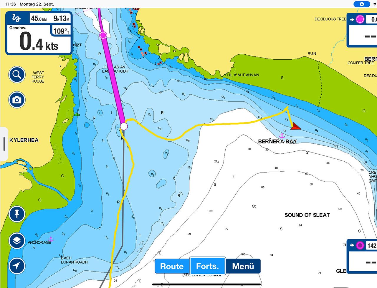 Um 12:50 Uhr (HW Dover +0,5h) heben wir den Anker und fahren mit Motor durch den Kyle Rhea ins Loch Alsh. Wir passieren die Brücke von Kyleakin. Anschließend setzen wir bei W–NW 4 Genua 3 und Großsegel und segeln durch den Inner Sound in den North Minch – mitlaufende Tide und Abenddämmerung begleiten unseren Kurs.
