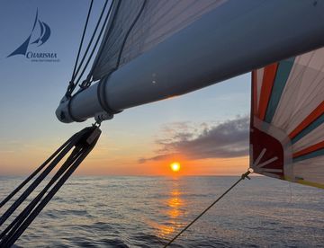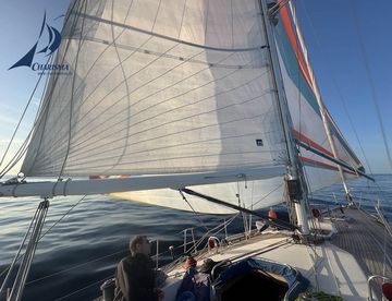 Eine schöne Backstagsbrise löst die Flaute des Nachmittags ab - so segeln wir unter Leichtwind-Spi in den Abend. Auch der Seegang hat sich beruhigt. In Nordmeerstimmung gleiten wir durch die Weite des Atlantiks. Delphine begleiten uns und an Steuerbord sichten wir einen Wal. Die spätere Auswertung der Bilder ergibt, dass es wahrscheinlich ein Pottwal war. Bei der leichter werdenden Brise spitzen wir den Anstellwinkel des Spis über den Jockeypole bis auf 65° zur Schiffslängsachse an und gleiten in friedvoller Abendatmosphäre durch das ruhige weite Meer. Mit Sonnenuntergang bergen wir den Spinnaker und segeln unter Genua 2 und Großsegel in die 14. Nacht.