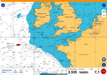 Die Warmfront beschäftigt uns seit drei Tagen - heute haben wir die Rückseite am Wickel, bzw, die windtechnisch günstige Konstellation fördert unser guter Vorankommen. Mit kontinuierlich 7 kn FüG rauschen wir unter Genua III und Großsegel im 2. Reff durch die bewegte See. Der Himmel ist bewölkt - hin und wieder kommt noch eine Portion Fisselregen von achtern auf, so richtig aufreißen will der Himmel nicht. In den letzten zwei Tagen hatten wir zwei sehr Etmale.