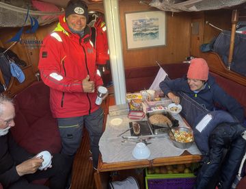 Die Zubereitung des Abendessens wird zusehens zum Staffellauf. Eine Abordnung beginnt mit den Vorbereitungen und tritt dann ihre Wache an, die verbleibenden Freiwachler bringen das Werk zum Abschluss und auf den Teller. Heute gab es Kartoffelstampf mit Grünen Bohnen und Ei. Die Backstube war auch fleißig, auf der Back steht ein frisch gebackenes Brot - die Form ist etwas windschief … wir haben vergessen die Kardanik des Ofens zu aktivieren. Dem Geschmack tut es keinen Abbruch.
