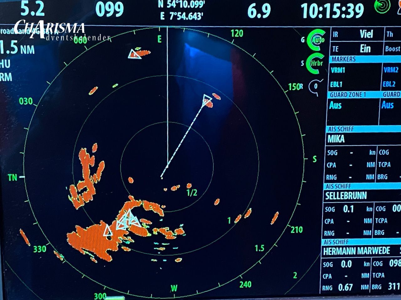 Bei Nacht und Nebel, wenn uns kein Feuer mehr den Weg weist, dann sind wir froh, dass wir AIS & Radar an Bord haben! Das Radarbild zeigt die Situation beim Auslaufen aus Helgoland bei pottendickem Seenebel. Wir haben mit der Einstellung „head-up“ eine vorausorientierte Darstellungsweise eingestellt. Der Vorteil hierbei ist, dass der Navigator und der Rudergänger die gleiche Perspektive auf das Geschehen haben - auf Basis einer klaren Kommunikation miteinander.