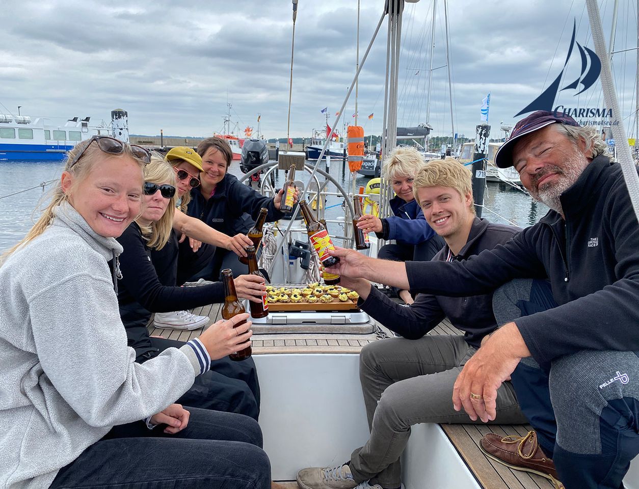 Bei Sonnenschein lassen wir mit dem Anleger im Cockpit den Segeltörn Revue passieren. Dank dem vorausschauenden Handeln unserer studentichen Hilfskräfte, haben wir auch noch etwas besonderes zum Anstoßen – Ebeltoft Øl. Und auch die Smutjes haben vorgesorgt – die beliebten Curry Happen stehen auf der Back! Zum Abendessen gehen wir in die Außengastronomie des Kieler Yacht Clubs und beschließen den Abend im gemütlichen Salon der CHARISMA.