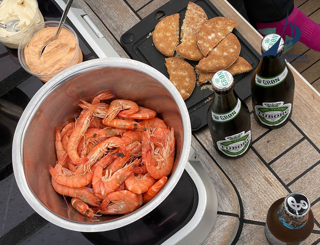 Mit Passieren des Leuchtturms Strib segeln wir durch die Kleine Belt Brücke und steuern den Stadthafen von Middelfart an, wo wir nach einem aktiven Segeltag an einem Kutter längsseits festmachen – Distanz 66 sm. Nun kommen die Leckereien vom Fischer auf die Back bzw. in die Pfanne. Zum Anleger gibt es Reje "selbst gepult" und zum Abendessen Torsk in (Düsseldorfer)-Senfsauce – lecker, lecker, lecker. Wir erleben erneut einen sehr lebendigen Abend an Bord der SY CHARISMA.