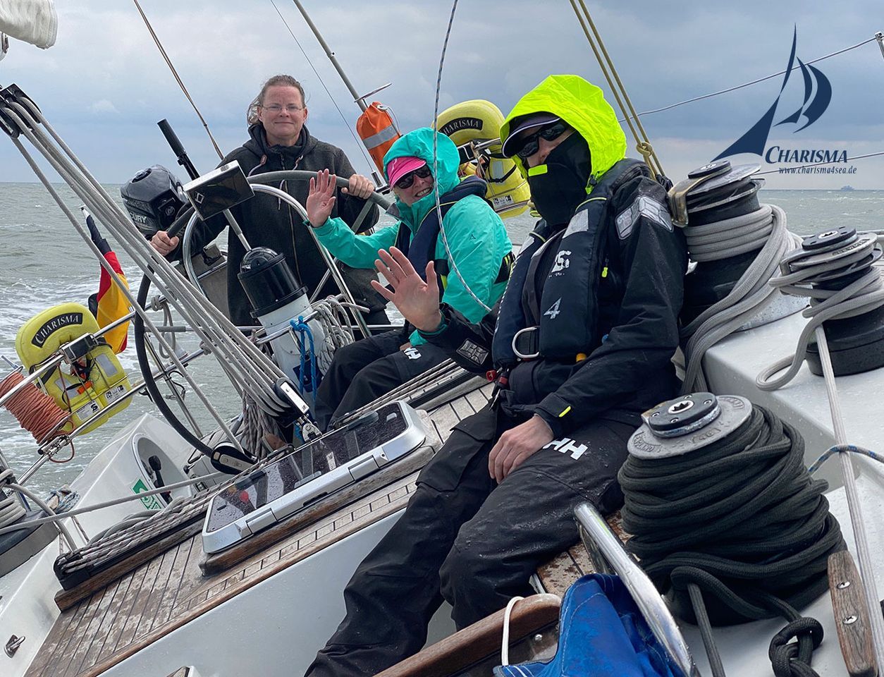 Wir segeln mit dem ablaufenden Gezeitenstrom am rechten Fahrwasserrand der Elbe in nordwestliche Richtung – zunächst unter Genua und erstem Reff im Großsegel. Der Wind weht S-SW 5 rechtsdrehend zunehmend 6-7 Beaufort, böig. Entsprechend binden wir die Reffs 2 und 3 ein und bergen schließlich das gereffte Großsegel. Wir segeln durch das Luechterloch mit strammem Kurs am Wind in die Norderelbe. Als wir die flachen Sände passiert haben, fallen wir ab.