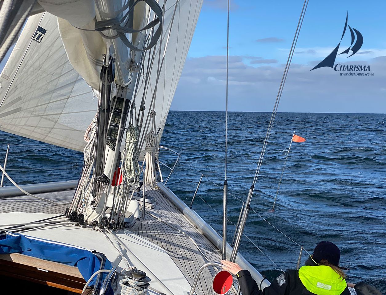 Das Hamburger Manöver überzeugt auch bei – im Vergleich zu den Schwerwettertrainings – moderaten Bedingungen. Wir bringen die Yacht auf Halb-Wind-Kurs und holen die Schoten dicht. Es folgt eine Wende, bei der die Fock stehen bleibt. Im beigedrehten Zustand steuern wir aktiv auf die Boje zu und luven zum Schluss an. Mit geringstmöglicher Fahrt nehmen wir die Boje in Lee auf. Diese überzeugende Handhabe der Yacht führt zu einem hohen Maß an Sicherheit und Verständnis der Crew zur Segelphysik. Am frühen Abend kreuzen wir in den Hafen von Helgoland und machen am Schwimmponton längsseits fest – Distanz 24 sm.
