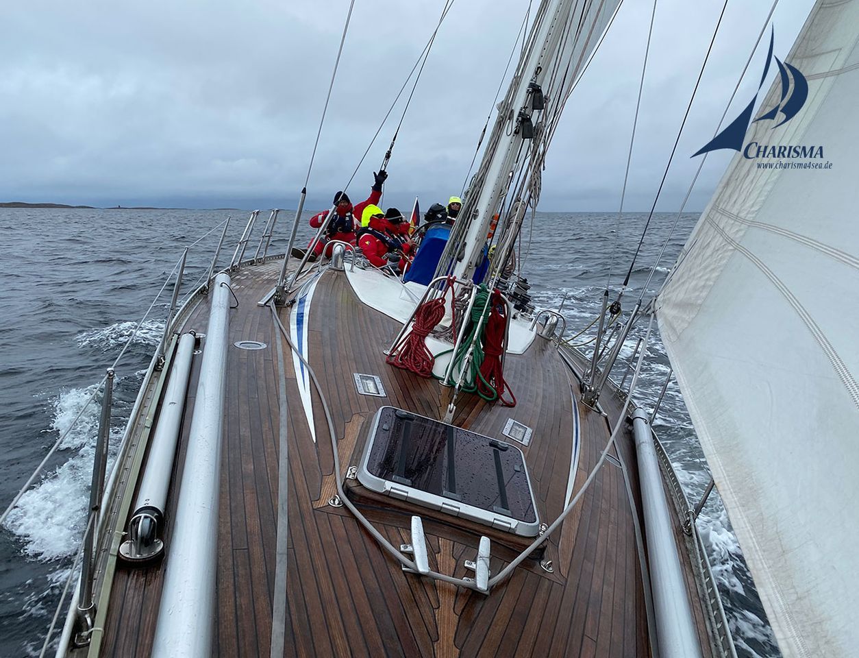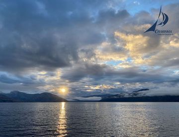 Am frühen Morgen legen wir noch bei Dunkelheit von der Tonnes Marina bei Windstille ab. Die Route führt uns durch den Stigfjord in südliche Richtung. Die Morgendämmerung führt zu Farbenspielen über der westnorwegischen Küste während die SY CHARISMA von der Crew mit aufmerksamen Wachen gesteuert wird.
