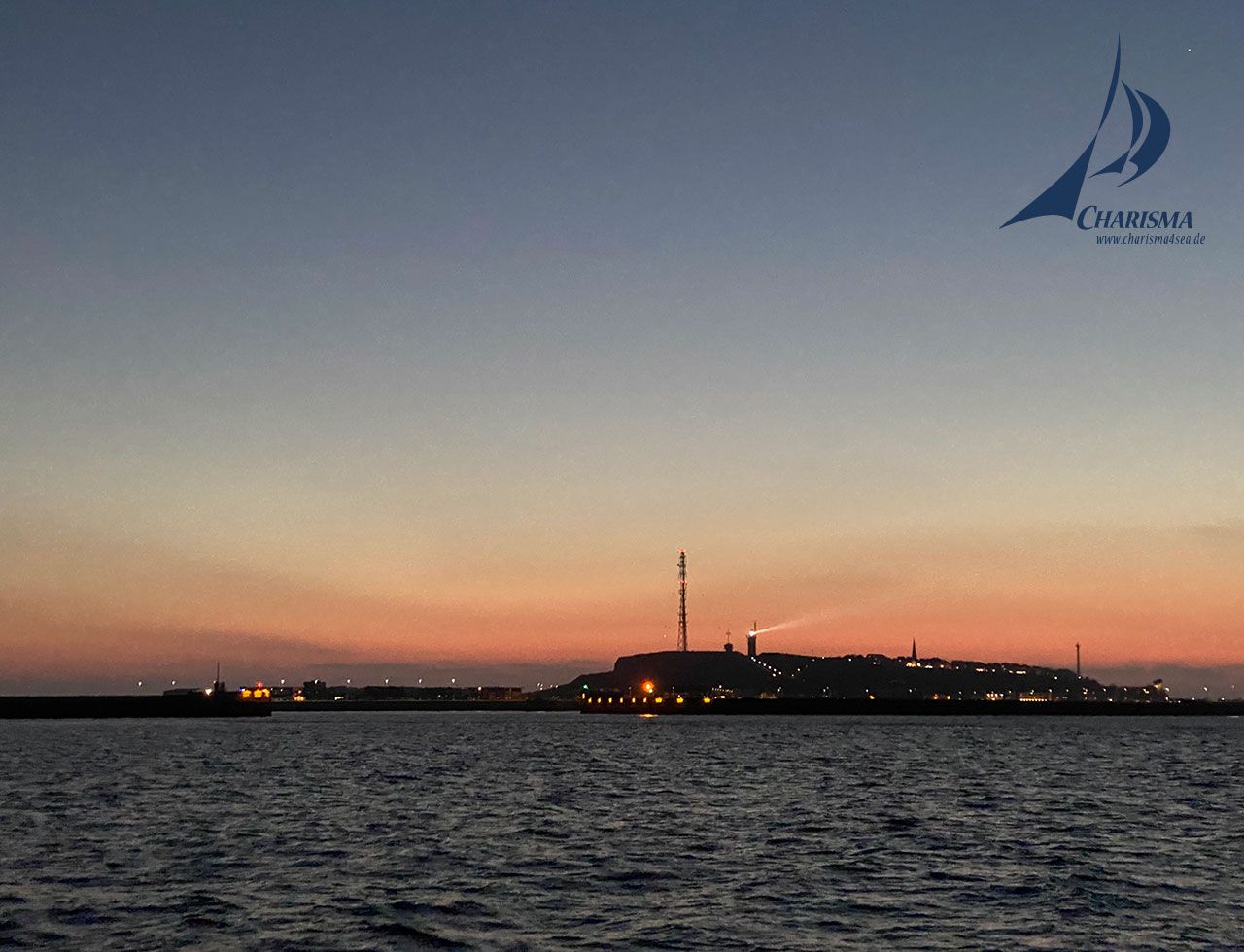 Wir steuern mit der einsetzenden ablaufenden Tide entlang des Elbe-Fahrwassers unter Motor gen NW und wählen die Passage durch das Luechterloch. Mit Einsteuern in die Norderelbe haben wir Strecke gegen den leichten NW-Wind gut gemacht, so dass wir nun unter Genua III und Großsegel durch die Deutsche Bucht einen schönen Anliegerkurs gen Helgoland segeln können. Der anfänglich durch die Konstellation Wind gegen die ablaufende Tide bedingte kabbelige Seegang beruhigt sich, je weiter wir in die offene See hinaussegeln. Aufgrund der polaren Kaltluft haben wir sehr klare Sicht und das Leuchtfeuer mit Blitz zu 5 Sekunden weist uns den Kurs gen Roten Felsen. Die sommernächtliche Ansteuerung hüllt die Insel in warme Farben, die kalten Temperaturen hingegen vermitteln eher das Gefühl im sehr hohen Norden unterwegs zu sein...
