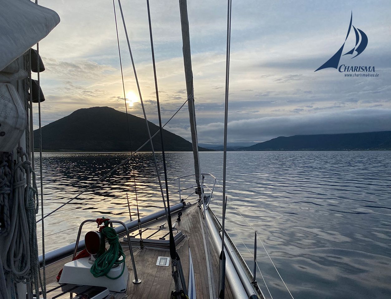Am frühen Morgen holen wir bei Windstille den Anker auf. Die Route führt uns durch den Tjeldsund mit östlichem und dann nördlichem Kurs. Dabei begleitet uns eine zunächst sonnige Atmosphäre, die sich bei polarer Kaltluft in eine blau-graue Nordlandstimmung wandelt.