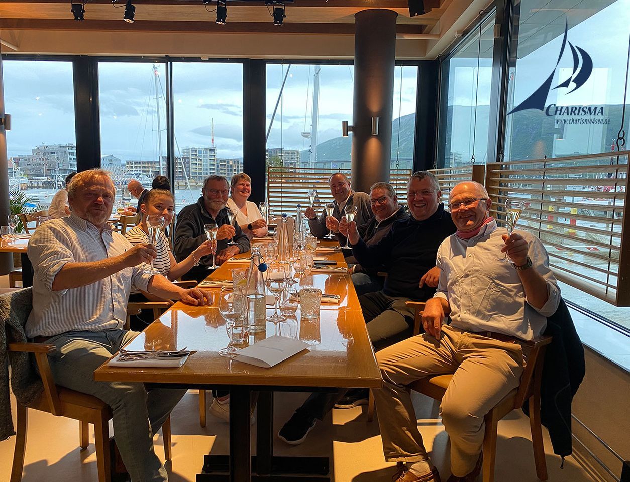 Bei aufklarendem Wetter steuern wir Tromsø an, passieren die Brücke und machen einen Zwischenstop an der Tankstelle. Schließlich steuern wir die Marina im inneren Stadthafen an und machen am Schwimmponton längsseits fest – Distanz 30 sm. Mit dem Anleger im Cockpit lassen wir den Segeltörn Revue passieren. Den Abend gestalten wir mit einem exquisiten Dinner im Restaurant Fiskekompaniet.
