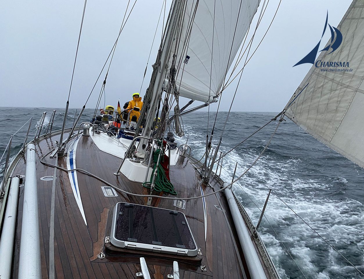 Wir passieren im Schutz der vorgelagerten Küstenstruktur Haugesund und steuern durch den Karmsund gen Süden. Am späten Nachmittag erreichen wir das in den Schären geschützt liegende Skudeneshavn – Distanz 37 sm. Wir nehmen uns eine Auszeit, analysieren die Wetterlage und legen am frühen Abend wieder ab. Bei Warmfrontwetter und Süd 5 Bft. segeln wir unter Genua III und Großsegel mit Kurs ESE in rasanter Fahrt der Insel Sveina entgegen.