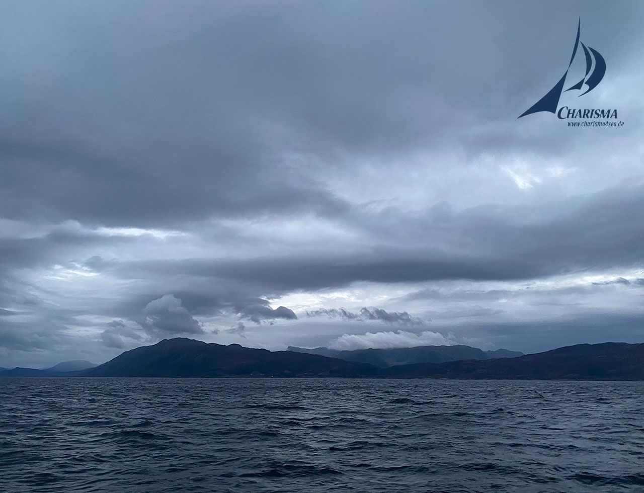 Den Gegenwind können wir zwar nicht aussegeln, wir kommen jedoch unter Motor gut voran. Die Route führt uns von der Florevika in südliche Richtung. Wir durchfahren die gängige innere Route, die durch Seezeichen gut gekennzeichnet ist. Die Navigation und das Steuern erfordert jedoch stets die volle Aufmerksamkeit. Dabei erleben wir die spektakuläre Szenerie der gebirgigen Landschaft im wechselhaft-grauen Licht- und Wolkenspiel.