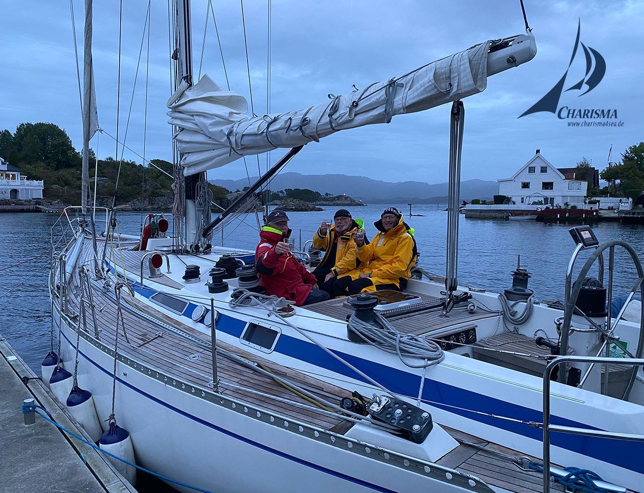 Das Wetter zieht zu, wird regnerisch und mild, der Wind schläft ein. Die weitere Fahrt setzen wir unter Motor fort und steuern an Leirvik vorbei in den Bömlafjord, neuer Kurs SW. Am Abend erreichen wir den Hafen Mosterhamn und machen an einem Schwimmsteg fest – Distanz 52 sm.