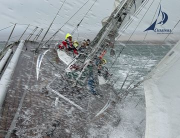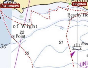Wir setzen das Großsegel ins dritte Reff und rollen mit der Genua III das Vorsegel aus. Mit restlicher ablaufender Tide segeln wir in der Küstenzone mit Kreuzschlägen nördlich des Windparks in westliche Richtung. Überkommende Seen waschen das Deck und die Crew. Im Tagesverlauf kentert bei strammem Wind die Gezeit. Der einsetzende auflaufende Flutstrom drückt uns entgegen in östliche Richtung. Umso mehr ist der Durchhaltewillen des Charisma-Teams gefragt bei dieser ungünstigen Konstellation am Tagesziel Portsmouth Harbour festzuhalten. An der mitgeplottetem Kurslinie unserer Yacht kann man den Einfluss der Gezeit aufgrund der sich verändernden Wendewinkel gut erkennen.
