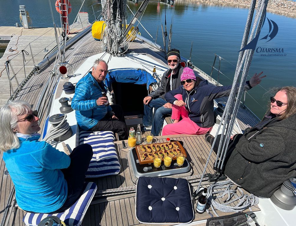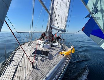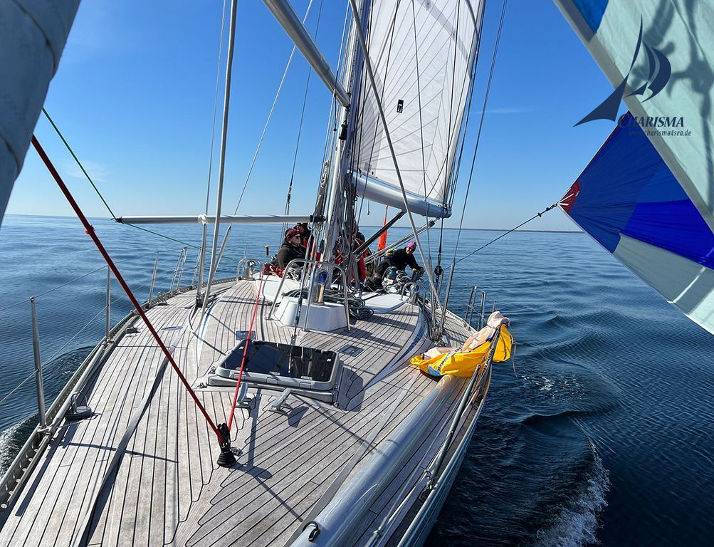 Es setzt eine leichte Brise aus E ein. Wir setzen unseren blauen Leichtwind-Spinnaker in der Leeabdeckung der Genua. Wir trimmen das 180 qm umfassende Tuch auf einen Anstellwinkel von 70° zum Wind. Dabei lenken wir den Achterholer (die luvwärtige Schot) über den Jockeypole um die luvwärtigen Wanten, so dass wir den Spinnakerbaum wie ein Bugspriet fahren können. Somit können wir den Spi flach trimmen und maximale Performance herausholen. Die SY CHARISMA gleitet mit ihren 15 t Verdrängung durch die ölglatte See – ein Genuss des Segelns.
