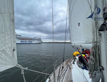 Nachdem der Proviant verstaut ist, nehmen wir über UKW Funkkontakt mit Radio-5 von Tallin auf. Wir bekommen die Erlaubnis auszulaufen – die Drehbrücke öffnet sich, wir passieren das Fährterminal und steuern in die Bucht von Tallinn. Mit einsetzenden W-NW 2-3 setzen wir das Großsegel und rollen die Genua III aus, um im nächsten Schritt den Spinnaker vorzubereiten.