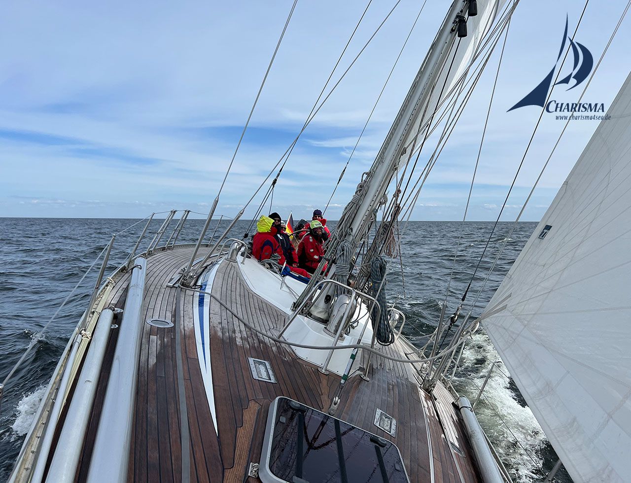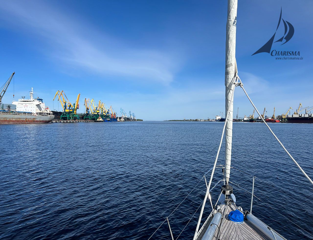 Die Fahrt führt zunächst unter Motor durch das Fahrwasser der Düna – gesäumt von Industrieanlagen, LNG-Terminals und großen Kohlebergen, die mit Baggern auf Stückgutfrachter verladen werden. Mit Erreichen der der Flussmündung setzen wir die Segel und steuern in den Rigaischen Meerbusen.