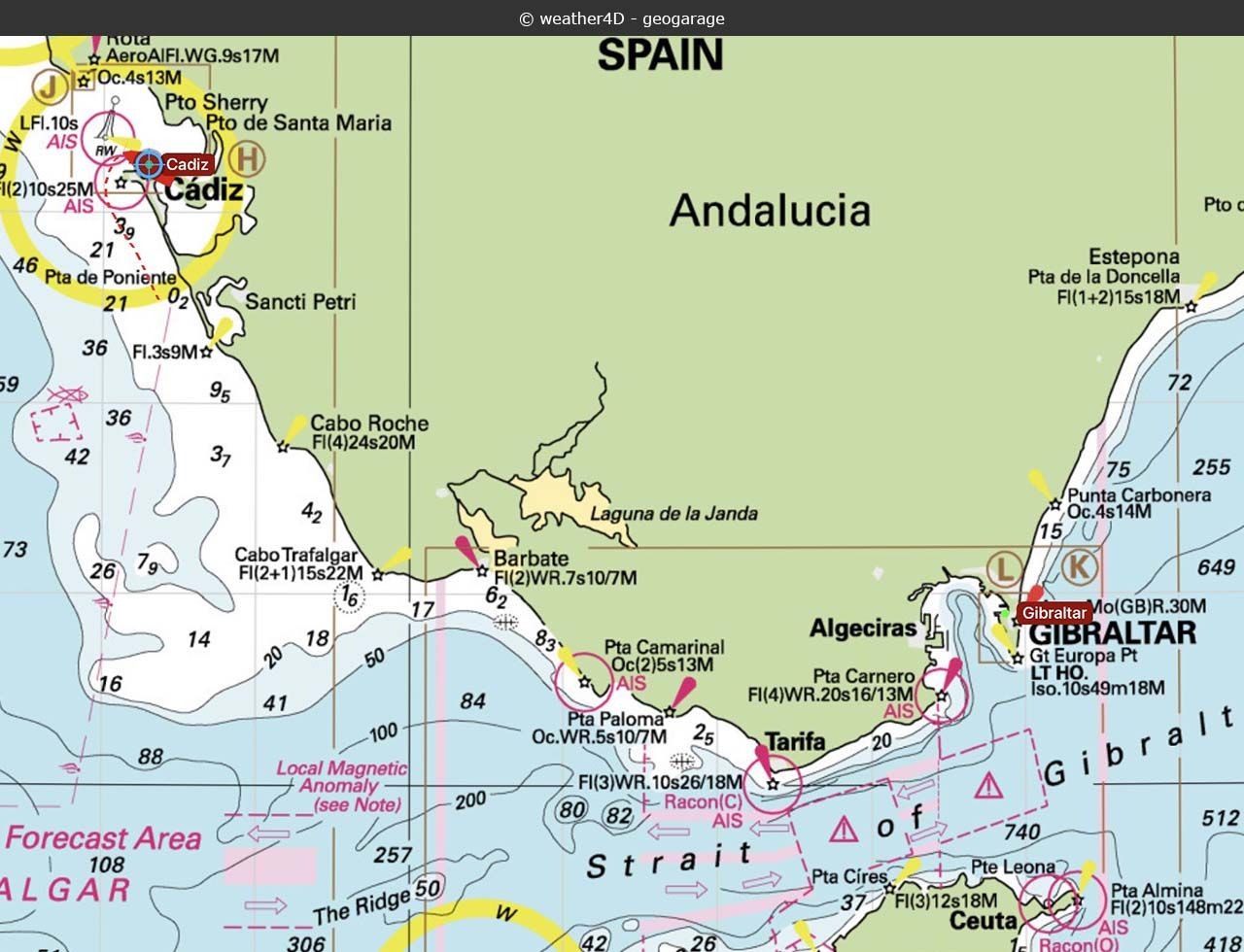 Nachdem am Vortag das Atlantik-Tief an seinem südlichen Rand zu westlichem Wind führte, hat nun wieder Hochdruckeinfluss das Zepter über der Straße von Gibraltar übernommen. Am frühen Morgen legen wir bei Windstille von Gibraltar ab.
