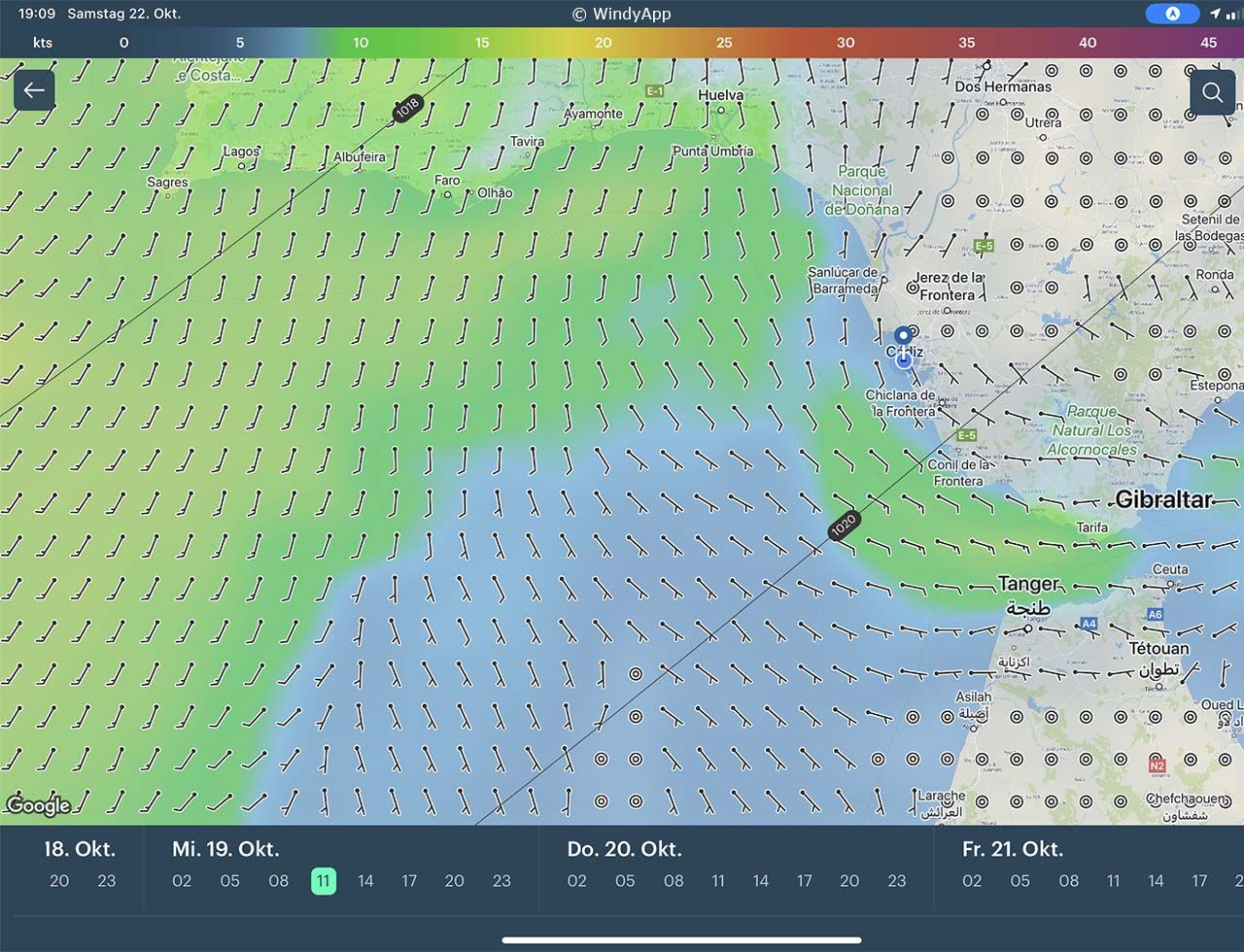 Das Atlantik-Sturmtief weitet seinen Einfluss nach Osten aus und erreicht damit in größerer Intensität Portugals Westküste. Da wir östlichen Kurs gen Gibraltar absetzen können, profitieren wir von der Wetterlage, die am südöstlichen Rand des Tiefs zu frischen SW-S Wind führt.