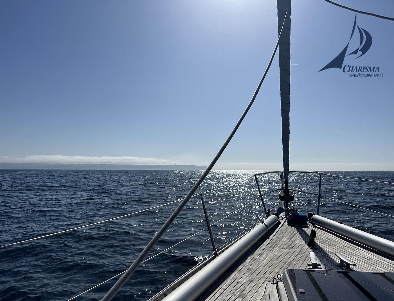 Die südliche Westküste Portugals liegt unter dem Einfluss eines umfangreichen kontinentalen Hochs – es weht weiterhin nur eine leichter Brise. Unsere Fahrt führt unter Motor mit südlichem Kurs vorbei am Cabo Espichel und weiterem Kurs SSE bis nach Sines. In der Abenddämmerung erreichen wir den Hafen Distanz – 55 sm.