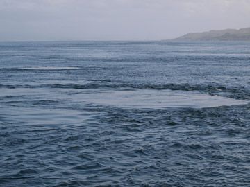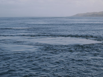 In der Mitte des Gulf of Corryvreckan schläft der Wind plötzlich ein. Im 3. Reff gleiten wir gemächlich durch das sprudelnde Wasser, vorbei an rießigen tellerförmigen Eddies.