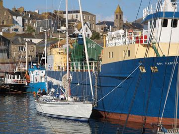 Der Wind weht frisch aus Nord. Im Fischereihafen von Penzance, Cornwall machen wir im Windschatten eines Frachtschiffes fest. Der Kapitän lässt die Strickleiter zu Wasser, damit wir an Land gehen können. Vor unserer Etappe durch die Keltische See legen wir einen Hafen-Sonntag ein und lassen den Wind auswehen.