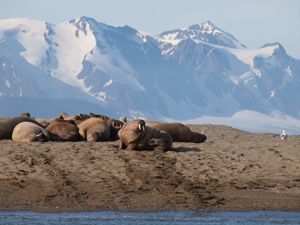 Am Morgen des 19. August 2014 holen wir den Anker auf und steuern rund um die vorgelagerten Untiefen in den Prins Karls Forlandsund. Der Wind hat über Nacht seine Intensität verloren und weht nur noch als leichte Brise. Wir steuern mit Poolepynten eine Huk vom Prins Karls Forland an, auf der sich eine Walrosskolonie befindet. Die Walrösser bilden eine wahre Trutzburg und sind im Verbund unangreifbar für Eisbären...