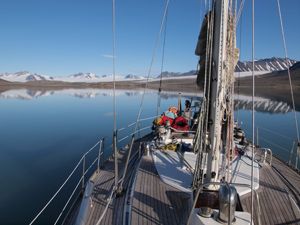 Am Morgen des 18. August 2014 holen wir in der Wilkinsbukta, im Norden des Isfjords, den Anker auf und steuern rund um die Huk von Daudmannsodden in den Prins Karls Forlandsund. In kurzer Zeit brist es auf Starkwind aus NNW auf, der Wind wird durch die Topographie des Sundes kanalisiert und pfeift uns entgegen. Hinzu kommt die Komponente Starkwind gegen die mit uns laufende Tide. Es entstehen kurze steile Wellen, die nur sehr ineffizient und unangenehm zu befahren sind. Die Fahrt über Grund reduziert sich auf 2,5 kn. Da Aufkreuzen bei diesen Naturverhältnissen keinen Sinn hat, steuern wir nach Analyse der detaillierten Seekarte und der Nautischen Literatur in den Schutz der am nächsten gelegenen Ankerbucht. Die Wahl fällt auf die Eidembukta, attraktiv gelegen zwischen vorgelagerten Granitfelsen und auslaufenden Gletschern. Zur Mittagszeit haben wir unser neu aufgefasstes Tagesziel erreicht und bringen den Anker aus.