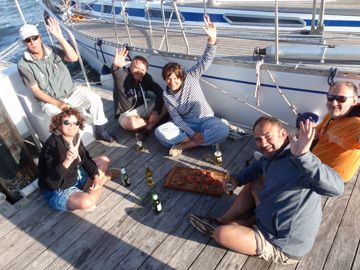 In einer kurzen Verschnaufpause des Windes nutzten wir den so frei gewordenen Liegeplatz für einen Anlegeversuch. Mittlerweile haben sich einige einheimische Segler in Ölzeug und Schwimmweste auf dem Steg versammelt. Stumm beobachten sie unser Anlegemanöver und sind im richtigen Moment mit einer helfenden Hand zur Stelle. Kaum haben wir die Charisma fest vertäut ist der Spuk vorbei. Die ersten Sonnenstrahlen blinzeln schon wieder vom Himmel, als wir uns bei unseren Helfern mit einer Stegrunde Bier bedanken. Auf unserer Frage, ob es hier solche Wetterphänomene öfter gibt ist die Antwort: „Never before we had had a storm like this.“ Da hatten wir ja dann quasi einen Sechser im Lotto!