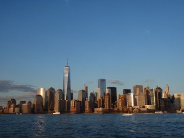 Die Abendsonne spiegelt sich in den Fassaden der Wolkenkratzer und taucht die Skyline von Manhatten in warmes Licht. Die Szenerie ist ganz friedlich. Ein klassischer Zweimaster kreuzt vor uns unter Seglen und macht das Bild perfekt.