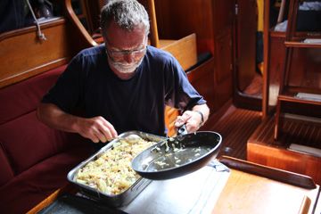 Während den zwei Sturmtagen hatten sich die "Profi-Köche" Bernd und Gerd bereit erklärt ein Essen auf den Tisch zu zaubern und den äußeren Bedingungen wie Welle, Krängung des Bootes zu trotzen.