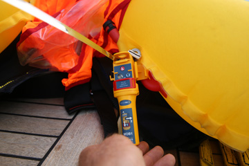 Elmo: Constantin wurde gestern Abend von der überkommenden See heftig geduscht, sodass die Rettungsweste auslöste. Auf diese Weise konnten wir die Funktionsweise des AIS MOB Gerätes überprüfen. Ein kleiner Sender, den wir an den Rettungswesten tragen, der im Falle des Überbordfallens auslöst und ein Notrufalarm über Funk sendet und die Position auf dem Plotter anzeigt. Reichweite etwa 10 sm. Aber die einzige Chance besteht sowieso nur, wenn man von dem eigenen Schiff gefunden und gerettet wird - oder zufällig ein Frachter in der Nähe. Aber wir wollen alle nicht ins Wasser fallen!