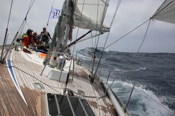 Ein Tief beim Trans Ocean Race haben wir noch und das bereitet viel Arbeit. Bis zur Ansteuerung des Englischen Kanals beschäftigen uns folgende Auswirkungen der Warmfront vor dem Tief: Wechselhafter SW-Wind, Nebel, Sprühregen und diesiges Wetter. In der tiefgrauen-schwarzen Nacht segeln wir bei bockigem Seegang nur unter Genua II, die wir raumschots zum Wind trimmen.