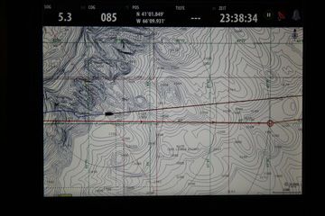 Elmo:In der Nacht dann ein heftiger Ritt auf einem Am-Wind-Kurs Richtung Osten. Bei mir purzelte alles aus der Koje und am Morgen glich das Aufstehen einer Klettertour - der Ausstieg aus der Lotsenkoje bei maximaler Krängung. Also über das Leesegel, ein Griff zum Vorschott, den Fuß auf den Tisch geschwungen, den Schwung am durchgesteckten Mast abgefangen, jetzt noch den hinteren Fuß über das Leesegel an der Kojenstütze vorbei manövrieren und vom Tisch springen und bei schaukelndem Schiff Halt auf dem Boden suchen. Und das alles ging ohne blaue Flecken... In der Nacht davor malträtierte mir jedoch das Begrenzungsbrett der Lotsenkoje hinter dem Leesegel meine Rippen. Durch die Krängung hing ich nämlich nur im Leesegel.