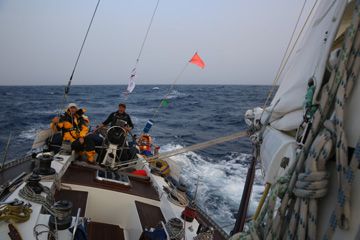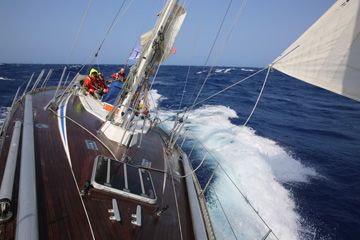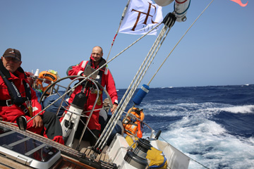 Jedes Crew-Mitglied des Charisma-Teams ist bestens eingestellt, zuverlässig und belastungsfähig. Wir jagen mit bis zu 11 kn rasanter Fahrt über Grund gen Osten. Zuvor haben wir mit Reff-Manövern das Schiff passend zur stürmischen Seefahrt eingestellt. Der Panther (Kosename der Neuengland-Crew für ihren Skipper) stinkt wie ein Ilits - aber es ist für einen guten Zweck: Wir kommen getränkt von Seewasserduschen gut voran.