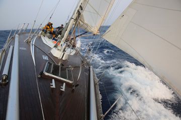Jetzt sind wir in der Front, die bereits seit knapp einer Woche vorhergesagt ist. Die Böen haben stürmischen Charakter - 30 kn scheinbaren Wind raumschots. Wir haben das Groß sukzessive bis ins 3. Reff verkleinert und schließlich ganz geborgen.