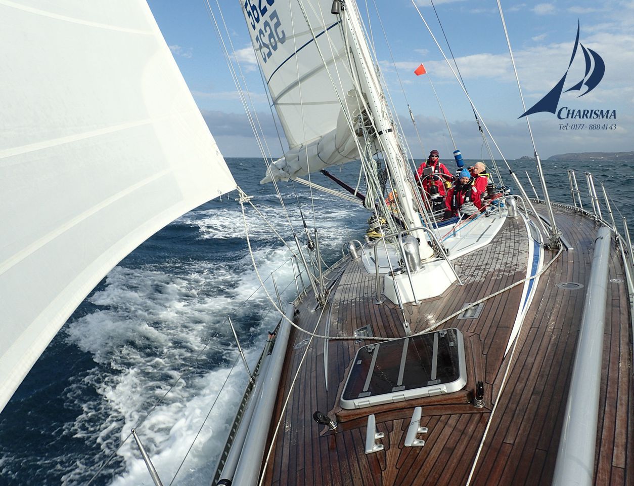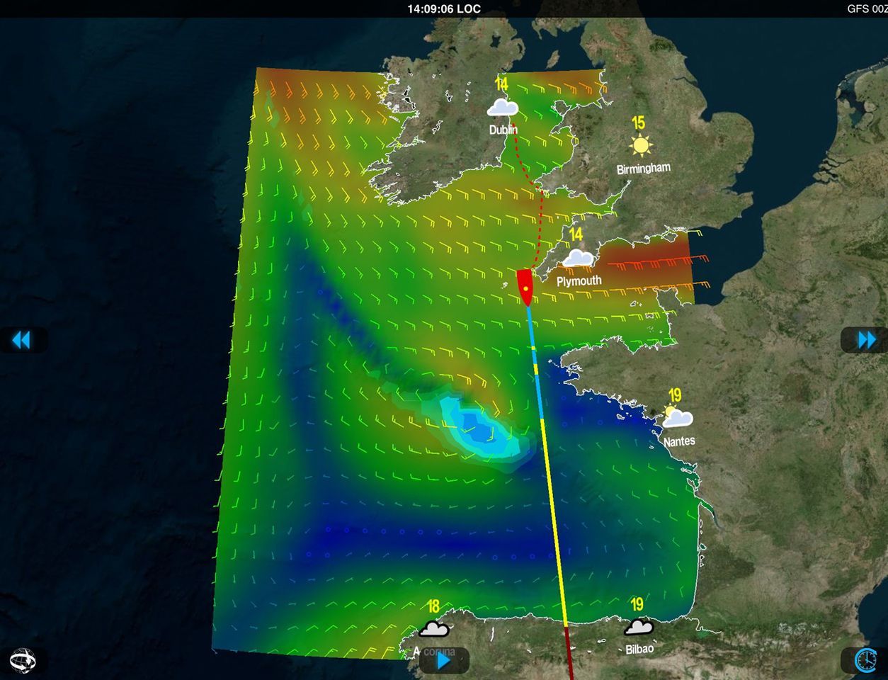 Die ursprünglichen Grib-Daten sagten ein Abschwächen des Windes in den Abendstunden vorher. Davon ist allerdings nichts zu spüren! Über unser satelitten-gestütztes Iridium-Go System holen wir vor Einbruch der Dunkelheit nochmals die aktuellsten Wetterinformationen ein. Das Starkwindfeld hat sich weiter über den Kanal bis nach Frankreich ausgeweitet. Wenigstens konsolidiert sich der Wind in der Nacht bei knapp 30 kn. Die Crew geht verlässlich ihre Wachen und steuert die Charisma durch die stürmische See.