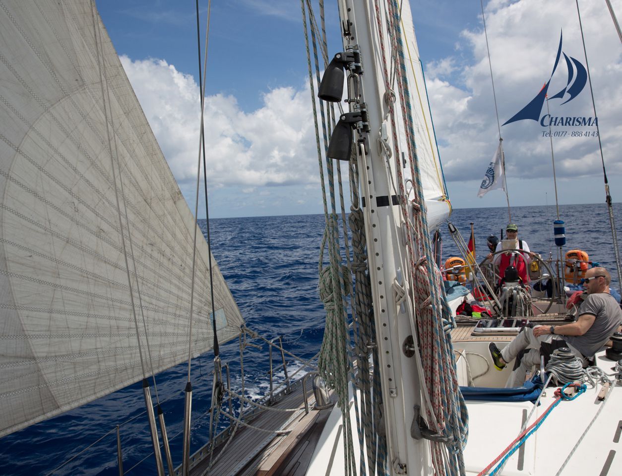 Sobald wir zur Mittagszeit nördlichen Kurs einschlagen, setzen wir unseren blauen Spinnaker. Der Wind wird am Nachmittag wechselhaft und schwach, stabilisiert sich jedoch am Abend wieder auf SE 3-4. Nach einer vorübergehenden Motoreinheit segeln wir wieder unter Genua II und Großsegel.