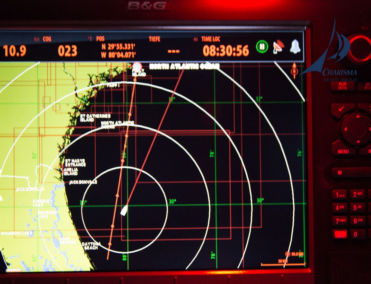 Wir ändern den Kurs auf NNE und haben ausschließlich Vorteile. Die Bootsgeschwindigkeit wird optimiert und steigt durch die Änderung vom Vorwind-Kurs auf Halbwind-Kurs um 50%. Wir machen statt 5,0 kn auf 7,5 kn Fahrt durchs Wasser. In der Nacht erreichen wir entlang des 80. Längengrades West den Golfstrom. Er setzt mit 2-4 kn in nördliche Richtung und verhilft uns zu einer Fahrt bis zu 12 kn Grund. Die Nachtfahrt ist unter dem klaren Sternenhimmel ein seglerischer Genuss und unsere Swan jagt durch die Wogen des Nordatlantischen Ozeans.