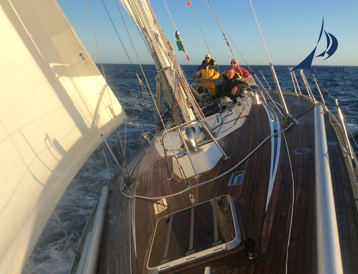 Der unstete Wind erfordert die Geduld der gesamten Crew. Mit Feingefühl segeln wir nach dem Wind, trimmen die Segel, fahren bei den variierenden Windrichtungen mit Wenden der Südküste Irlands entgegen. Am Abend ist es soweit: wir haben uns nördlich des Verkehrstrennungsgebietes hoch gearbeitet und können in der Abendbrise bei NW 2-4 Beaufort während des Sonnenuntergangs dem Fastnet Rock entgegen segeln.
