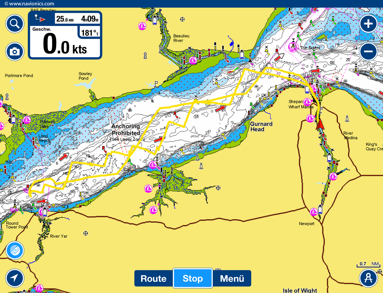 Wir kreuzen bei den gegenläufigen Kraftkomponenten Starkwind gegen auslaufenden Gezeitenstrom gen Hurst Point. Jedes Crewmitglied führt das vielfach bei den Schwerwettertrainings bewährte Boje-über-Bord Sicherheitsmanöver durch. Am Nachmittag kehren wir bei Niedrigwasser in die East Cowes Marina zurück.