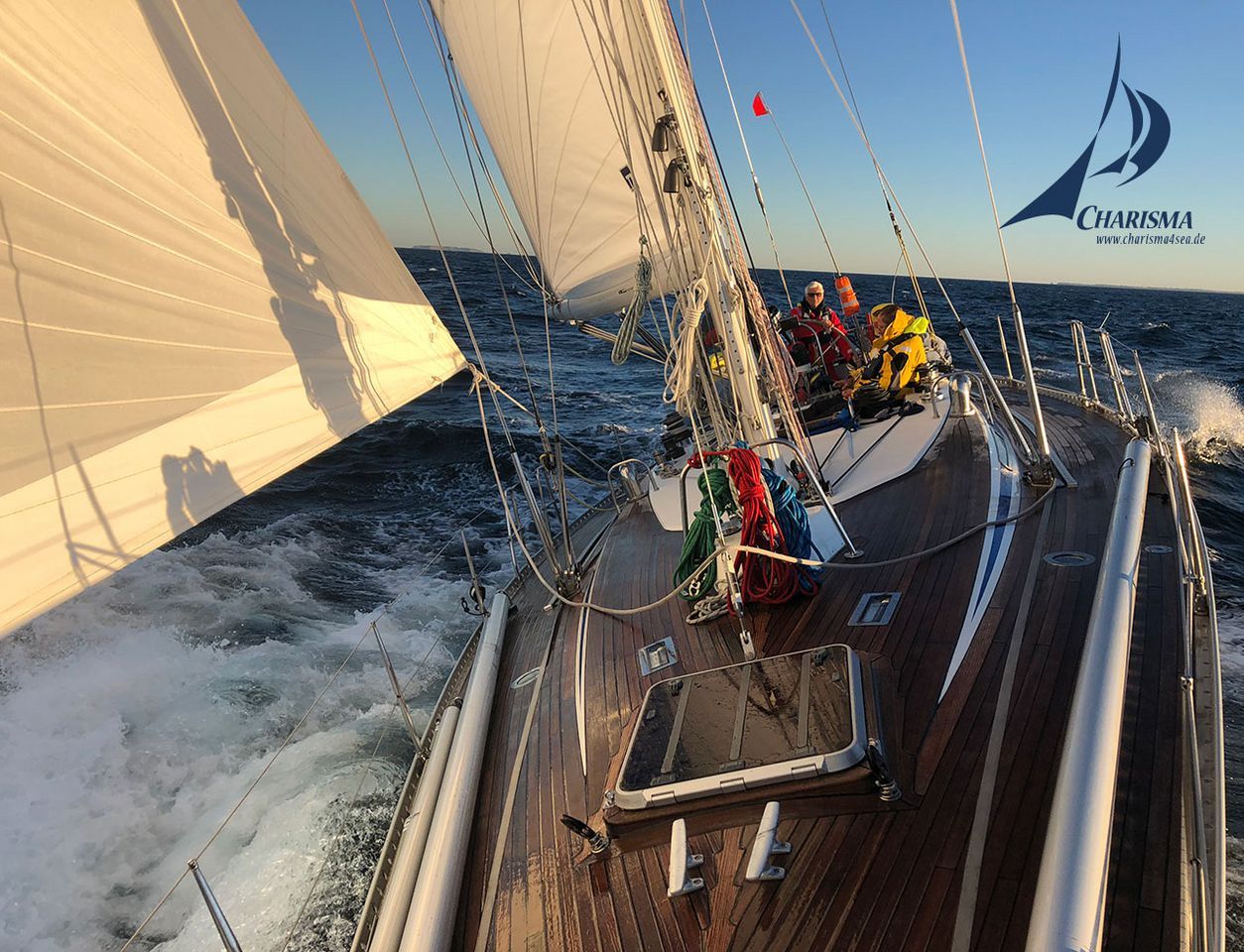 Am Vormittag haben wir perfekten Segelwind: E 3-4 Bft. mit Böen zu 5 Bft. Die SY Charisma jagt unter Genua II und Großsegel mit Rumpfgeschwindigkeit dem Cabo Rasa entgegen – tolles Swan-Segeln entlang Portugals Westküste!