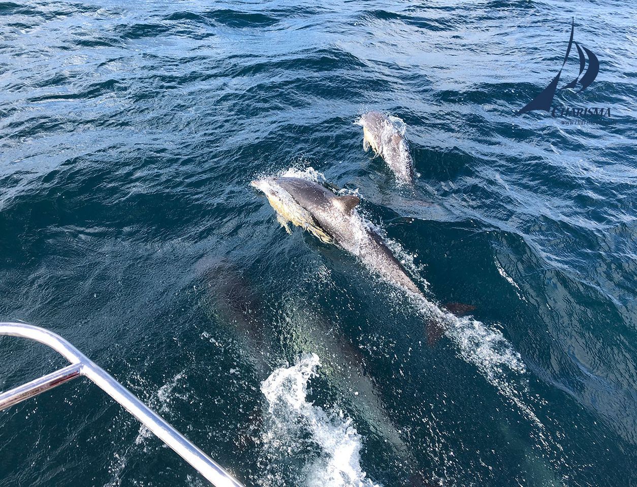 Auch in der Biskaya ist eine Menge los - viel Schiffsverkehr. Fischereifahrzeuge, Frachter und regattierende High-Speed Yachten passieren uns. Wir segeln in die Morgendämmerung und werden von quicklebendigen Delfinen begleitet. Mittlerweile hat der Wind leicht rechts auf SE 4 gedreht. Wir passen bei sonnigem Wetter unseren Kurs auf SW an und segeln mit Rumpfgeschwindigkeit nunmehr Anliegerkurs gen La Coruña.